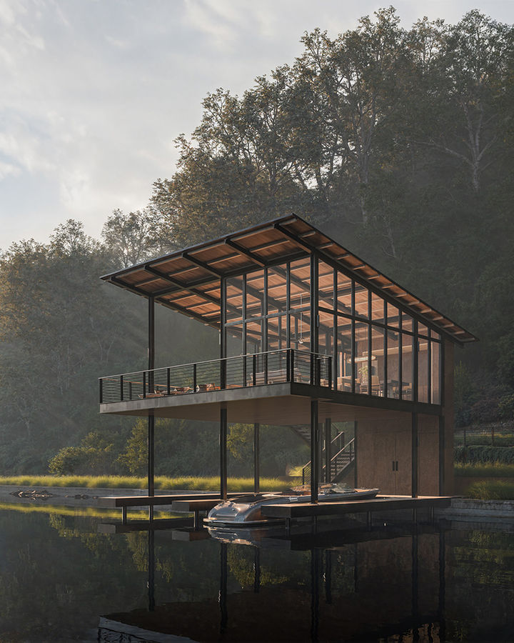 Designed for lakeside living and waterfront entertainment, this boat dock on Lake Austin was thoughtfully crafted using durable, low-maintenance materials. The design highlights the structural elements while maintaining a timeless material palette featuring painted steel, smooth wood, and weathered steel panels. Its split-level layout seamlessly follows the natural slope of the land and integrates smoothly with the existing bulkhead, creating a harmonious connection between dock and shoreline.