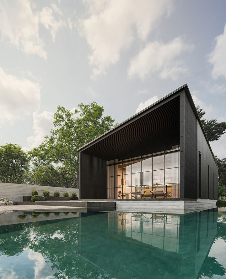 This modern casita embraces the elegance of simplicity, where clean lines and thoughtful form create a timeless beauty. Its long, slender bar shape runs parallel to the existing main house, thoughtfully framing a serene side courtyard. This intimate outdoor space, lined with a graceful row of olive trees, becomes the perfect setting for early evening gatherings—whether enjoying hors d'oeuvres or lively parties.